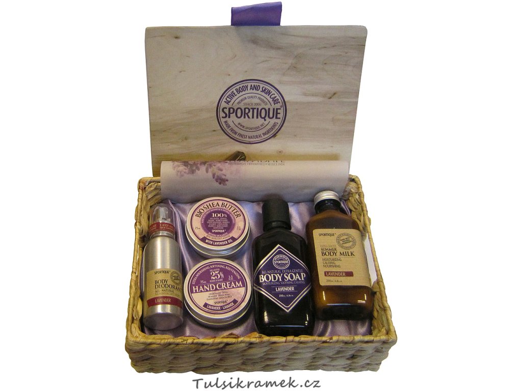 Tento překrásný dárkový košík obsahuje: PŘÍRODNÍ TĚLOVÉ A OBLIČEJOVÉ MÝDLO LEVADULE (200 ml), TĚLOVÝ DEODORANT LEVANDULE (100 ml), BIO BAMBUCKÉ MÁSLO LEVANDULE (75 ml), KRÉM NA RUCE A NEHTY S 25 % BAMBUCKÉHO MÁSLA LEVANDULE (75 ml), TĚLOVÉ MLÉKO LEVANDULE (200 ml).
