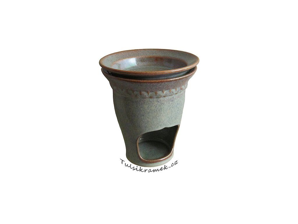 Celá aromalampa červenomodrošedého odstínu, tzn. miska i tělo aromalampy je hladké, glazované.
